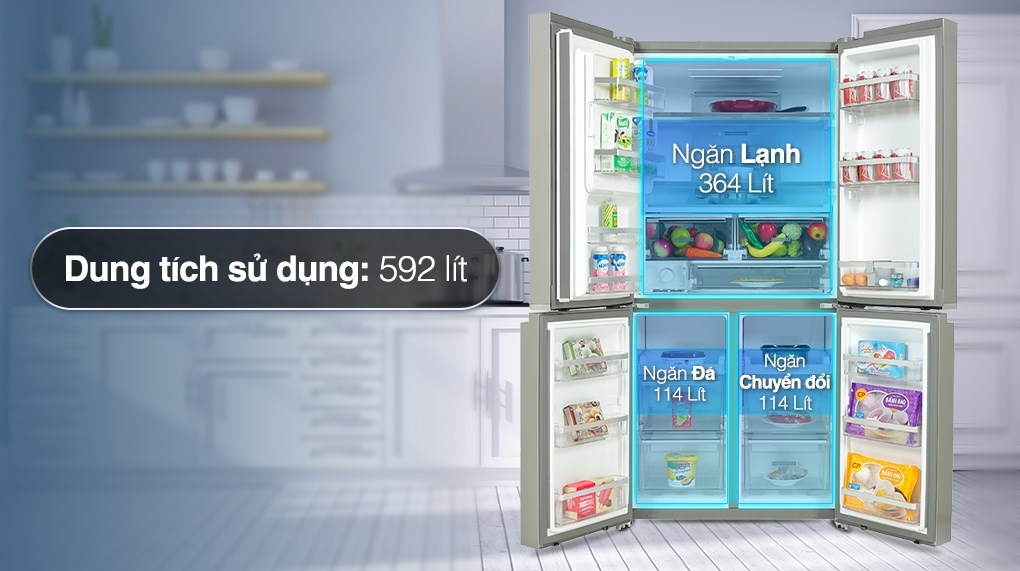 Dung tích sử dụng lên đến 364 lít với thiết kế các ngăn chứa rộng mở, dễ dàng lưu trữ các thực phẩm có kích thước lớn cùng các đa dạng các loại ngăn chứa, giúp người dùng phân loại thực phẩm một cách tiện lợi.